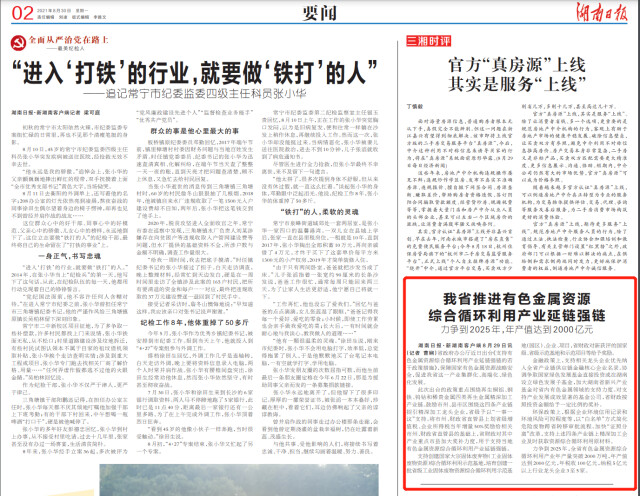 省政府办公厅近日出台《支持有色金属资源综合循环利用产业延链强链的若干政策措施》,保障国家有色金属资源战略安全,促进我省这一产业集群化、高端化、绿色化发展。