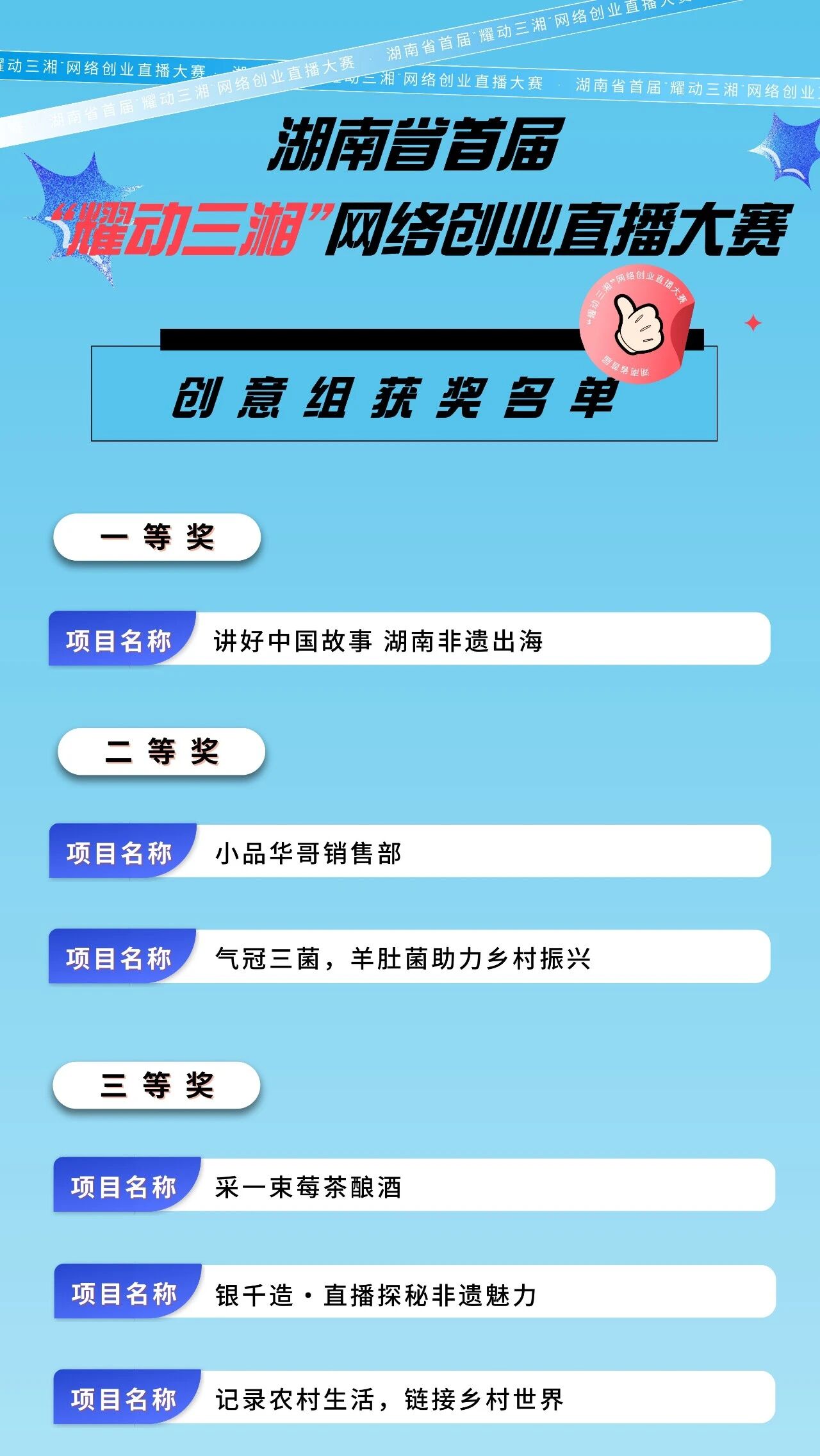 12月19日,我省首届“耀动三湘”网络创业直播大赛落下帷幕,这是湖南首次以“直播+创业”的形式办赛,56个项目参与竞逐。12月20日,大赛颁奖仪式在长沙举行,28个项目脱颖而出,分获创业与创意2个组别的一二三等奖和优秀奖。